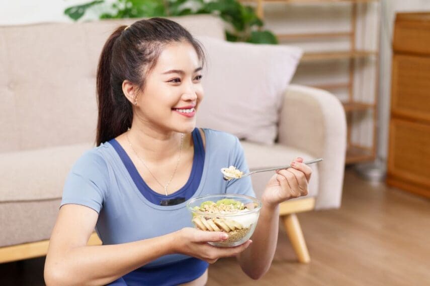 Staying hydrated throughout the day can help you stay energized and suppress feelings of hunger. Start with nutrient-rich drinks like milk and include water, seltzer, or green tea for excellent options to keep you alert and focused. Drink up!