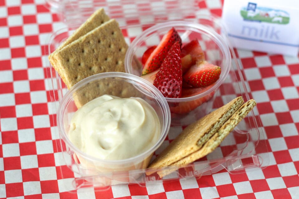 - Assemble bento boxes with a #10 disher of nutty yogurt dip, ½ cup strawberries, and 4 graham crackers. Hold and serve at 41°F or below.