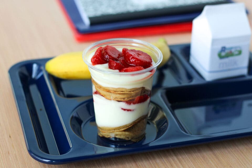 A hit with both students and adults, this colorful parfait layers whole-grain mini pancakes, smooth vanilla yogurt, and ripe USDA strawberries for a fun, portable breakfast. Each serving is low in added sugar and provides 6 grams of protein, 4 grams of fiber, and a ½ cup of fruit to help meet meal pattern standards. Easily customizable with blueberries, raspberries, or a berry mix, it’s a quick, no-cook option that makes mornings easier and healthier.